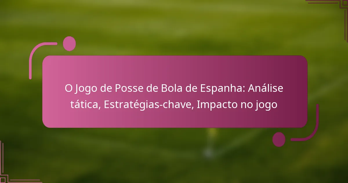 O jogo de posse de bola da Espanha é uma marca táctica que enfatiza o controlo da bola, passes curtos e movimentos inteligentes sem a bola. Ao manter a posse, ditam o ritmo do jogo e criam oportunidades de golo, explorando eficazmente as fraquezas dos adversários. Esta abordagem estratégica não só melhora o seu jogo, mas também impacta significativamente os resultados das partidas, uma vez que percentagens elevadas de posse frequentemente levam a resultados bem-sucedidos.